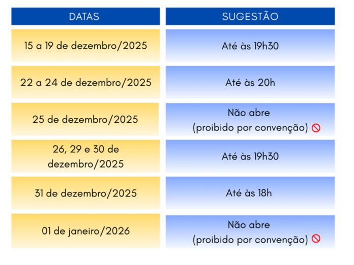 De acordo com as normas estabelecidas na Convenção Coletiva 2025/2026, firmada entre SECUA e SINDICOMÉRCIO, o Comércio Varejista de Gêneros Alimentícios e o Comércio Lojista, não estão autorizados a funcionarem nos dias 25/12/2025 e 01/01/2026.