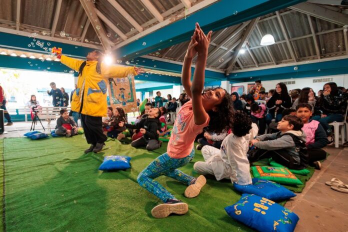 O projeto também leva às escolas uma biblioteca itinerante com leituras encenadas e apresentações teatrais que tornam a alfabetização mais lúdica e prazerosa.